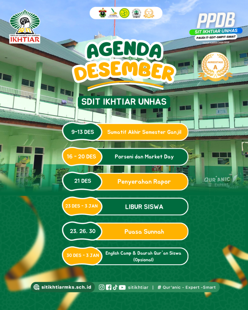 AGENDA BULAN DESEMBER SDIT IKHTIAR UNHAS 9-13 : Sumatif Akhir Semester Ganjil 16-20 : Porseni dan Market Day 21 :